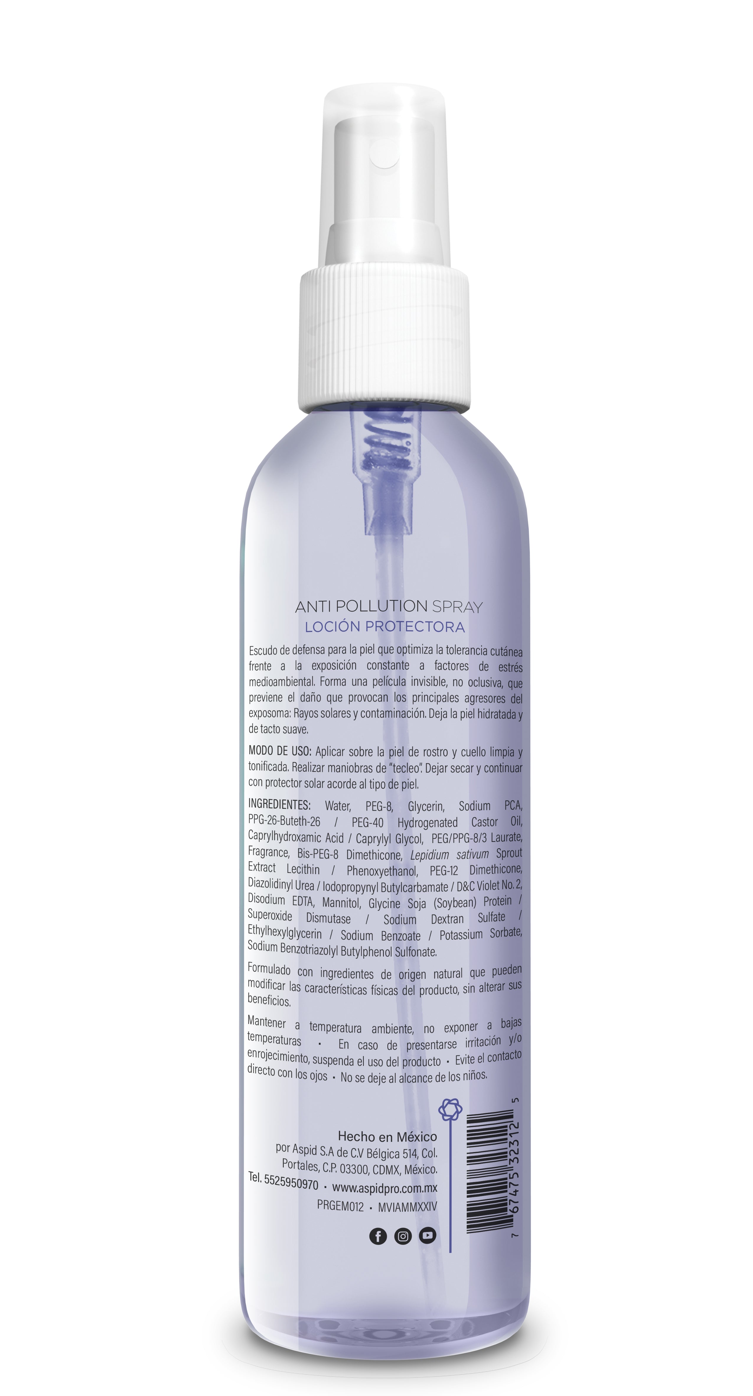 Loción anti polución de uso diario para brindar máxima protección ambiental y mantener fortalecida la barrera cutánea. Refresca,, hidrata y protege de factores ambientales.