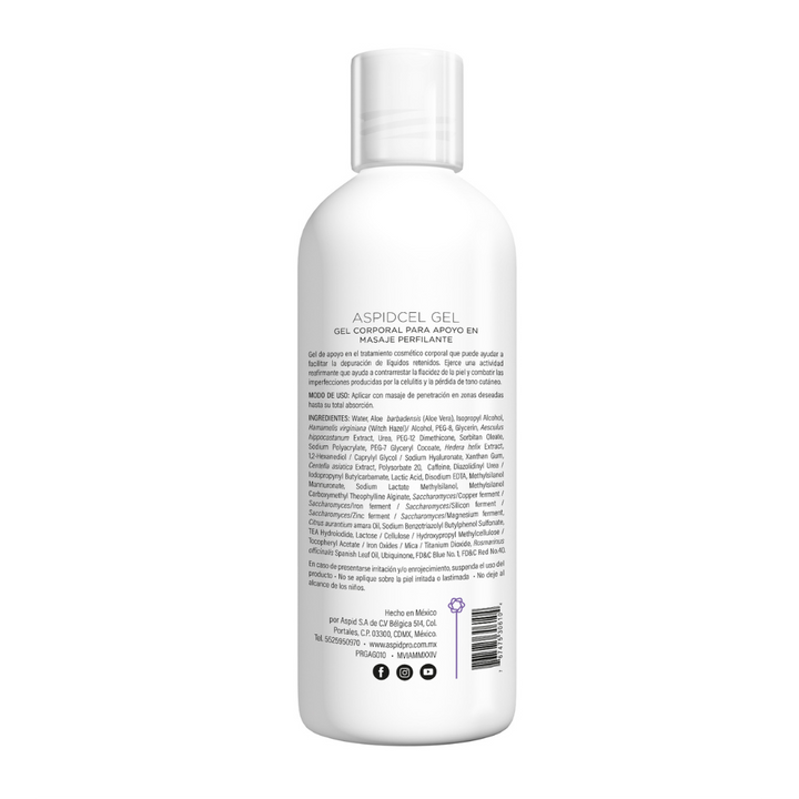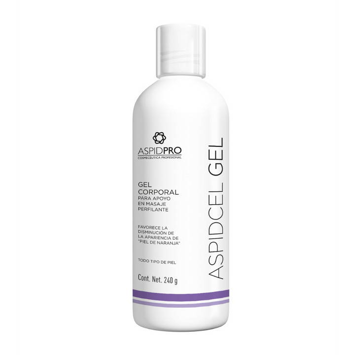 Aspidcel gel es un gel de apoyo en el tratamiento cosmético corporal que ayuda a promover el metabolismo dinámico y facilita la depuración de toxinas y líquidos retenidos. Ejerce una actividad reafirmante que contrarresta la flacidez de la piel y funciona como coadyuvante complementario en un régimen de pérdida de grasa corporal a largo plazo, ya que combate efectivamente las imperfecciones producidas por la celulitis y la pérdida de tono cutáneo. Ideal para su aplicación en cabina dentro de protocolos corporales perfilantes con masaje manual o con cualquier herramienta o aparatología.