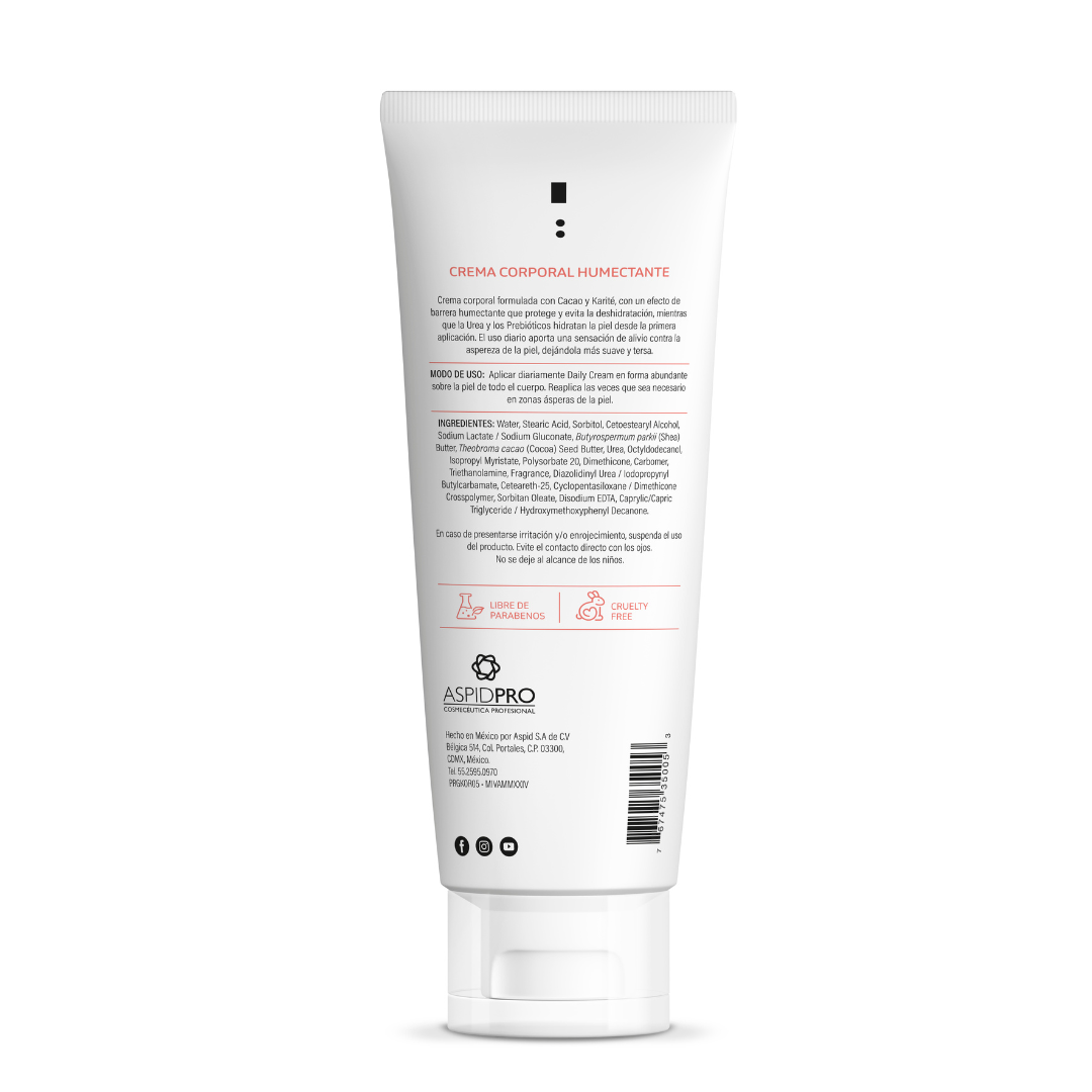 El hábito de hidratar y humectar la piel corporal todos los días previene el deterioro de su función barrera y favorece la retención hídrica y lipídica en la piel para que luzca sana e hidratada. El concepto “equilibrante” de la crema corporal Daily cream se centra en ayudar a la piel deshidratada y seca a retener la humedad y ayudar a reparar visiblemente la resequedad y tirantez. Optimizada con ingredientes como la urea y prebióticos, dando lugar a una mejora notable en la textura y elasticidad desde la primera aplicación.