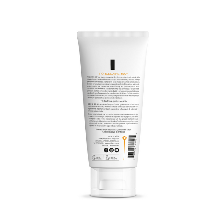 PORCELAINE 360° representa un enfoque renovado, cuyo diseño de fórmula consiste en la combinación de filtros solares químicos altamente fotoestables y de amplio espectro con la protección global de moléculas dermatológicas específicas.
