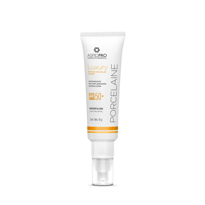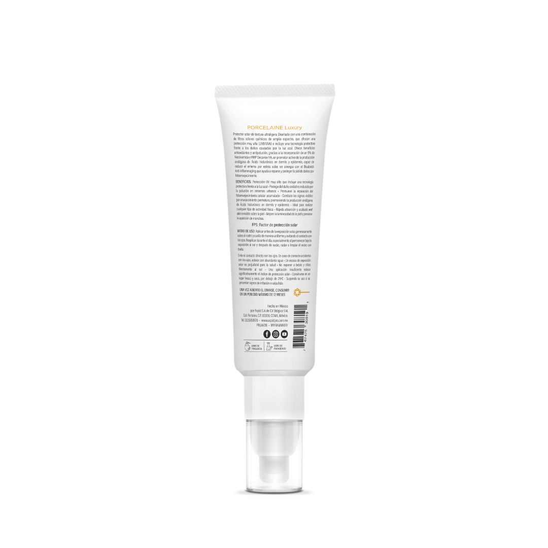 PORCELAINE Luxury es un protector solar de textura aqua-fluid con función anti-inflammaging que repara y protege la piel de daños por fotoexposición. Proporciona protección antioxidante y antipolución, gracias a la Niacinamida 5% y HMP Decanox HA 1%, el cual ofrece una eficaz defensa contra los radicales libres producidos por la luz UV y HEVL, siendo además un promotor activo de la producción endógena de ácido hialurónico en dermis y epidermis, capaz de reducir el eritema por estrés solar, en sinergia con el Bisabolol. Previene eficazmente la aparición de manchas y mejora los resultados de tratamientos despigmentantes alternos.