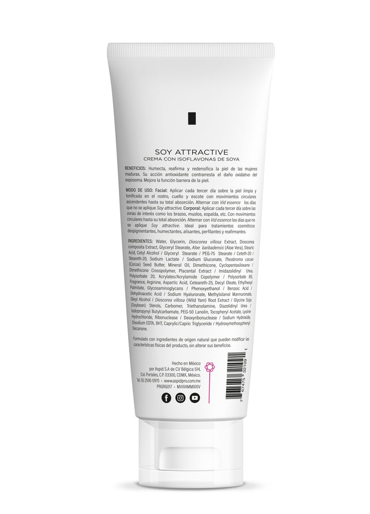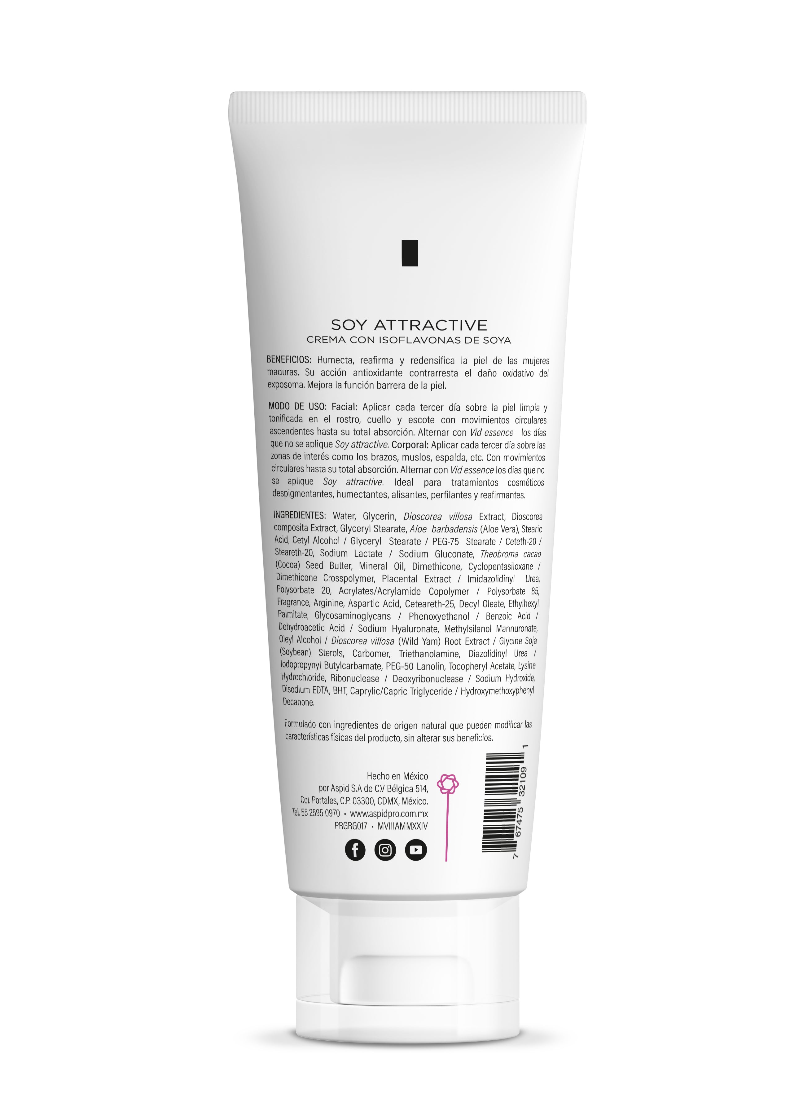 Facial: aplicar cada tercer día sobre la piel limpia y tonificada en el rostro, cuello y escote con movimientos circulares ascendentes hasta su total absorción. Alternar con Vid Essence los días que no aplique Soy attractive.