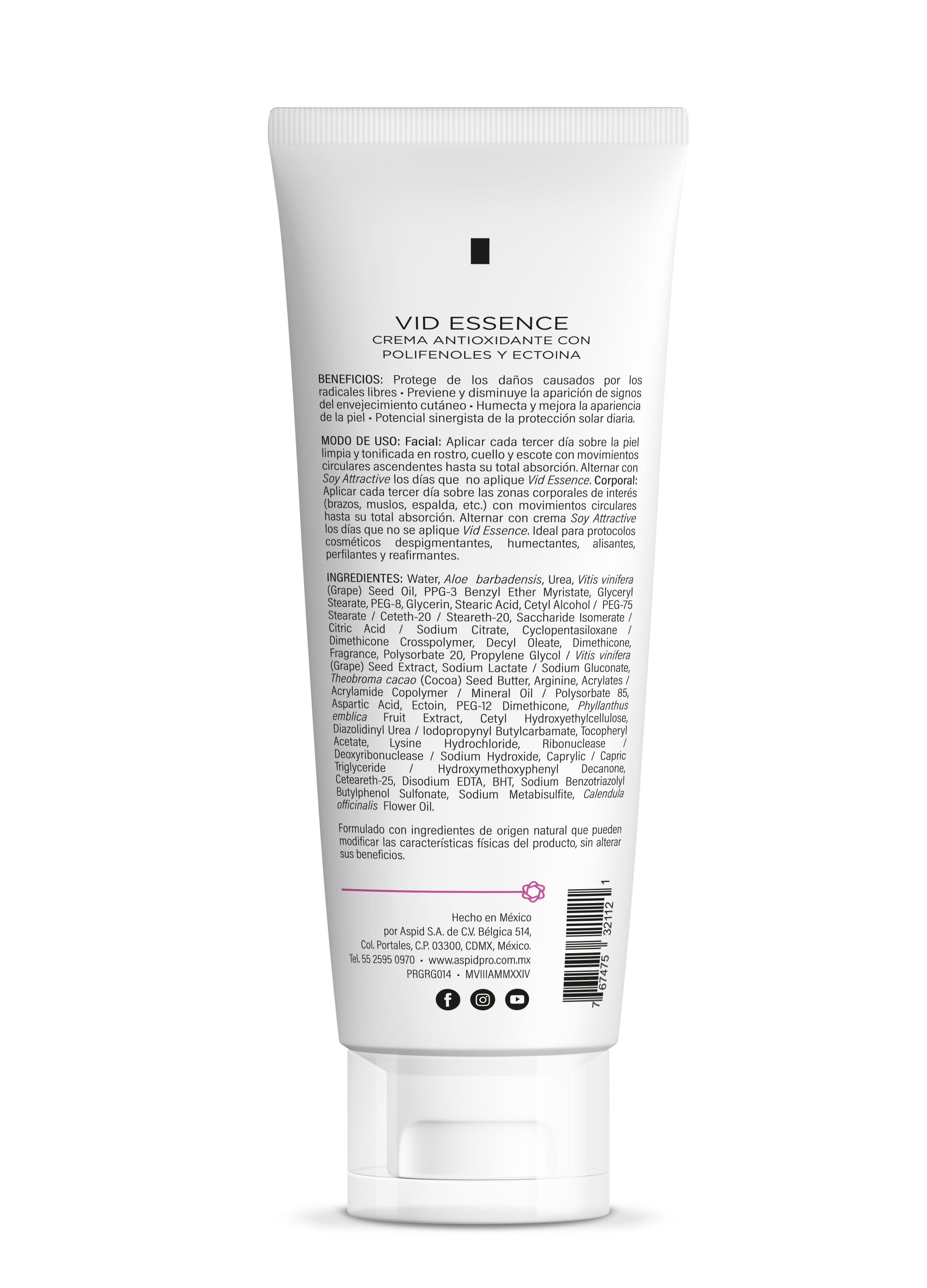 Corporal: Aplicar cada tercer día sobre las zonas de interés como los brazos, muslos, espalda, etc. Con movimientos circulares hasta su total absorción. Alternar con crema Soy Attractive los días que no se aplique Vid Essence.