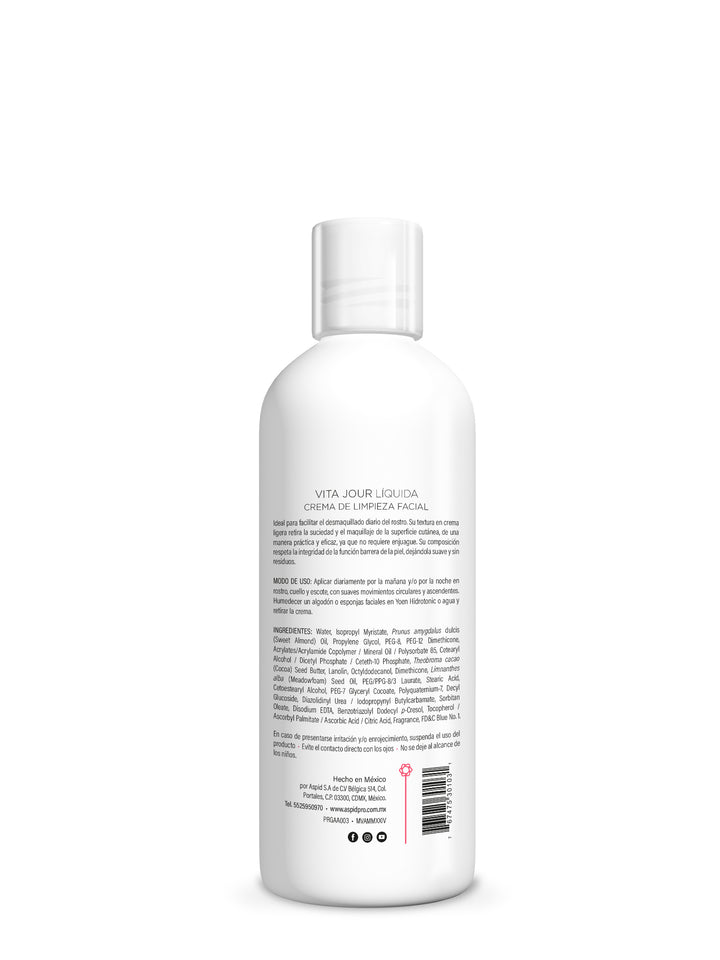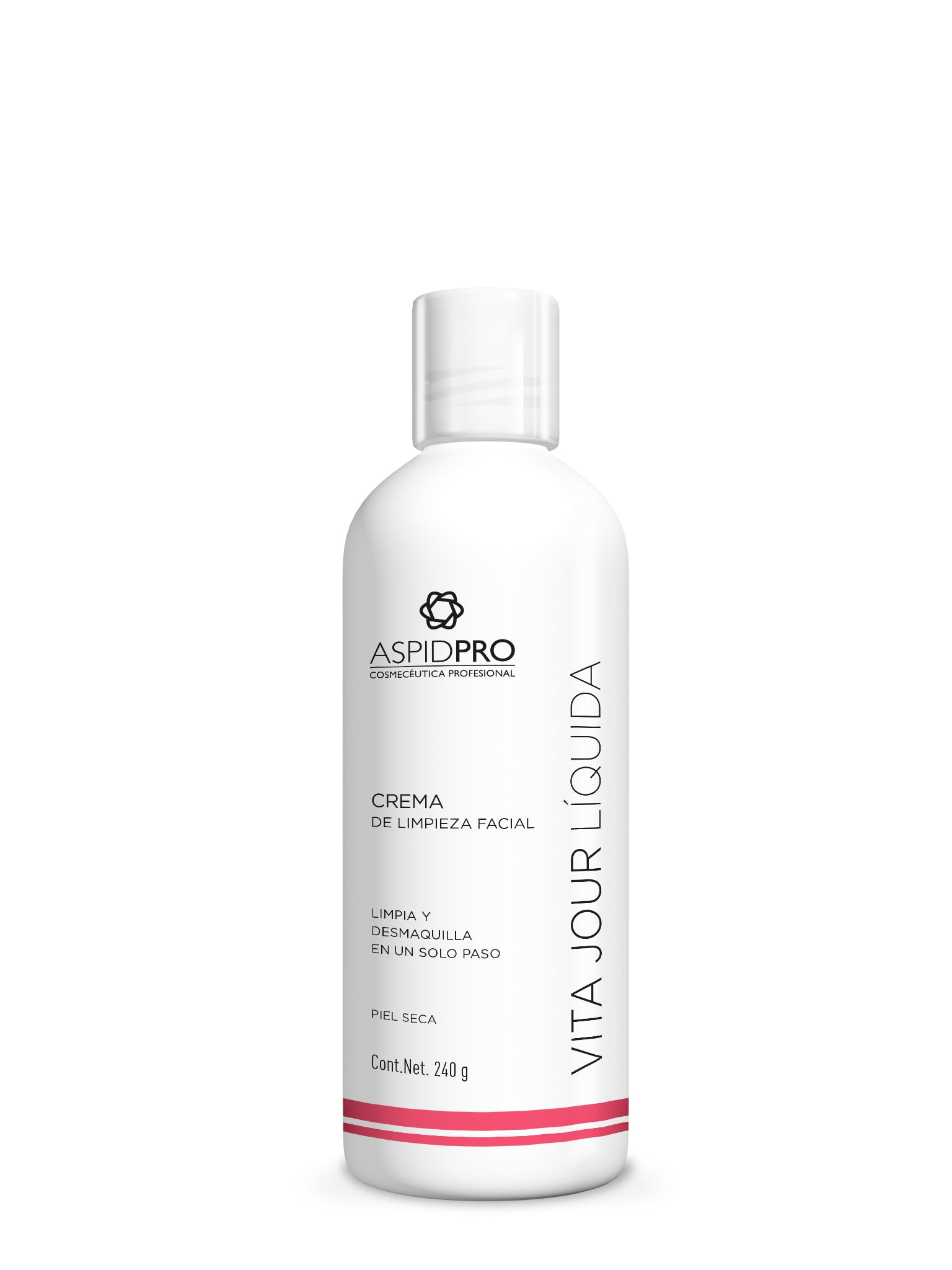 Vita jour líquida es una crema limpiadora que protege la barrera hidrolipídica de la piel, al tiempo que la limpia de manera efectiva, su textura ligera es ideal para una piel seca o con sensibilidad.