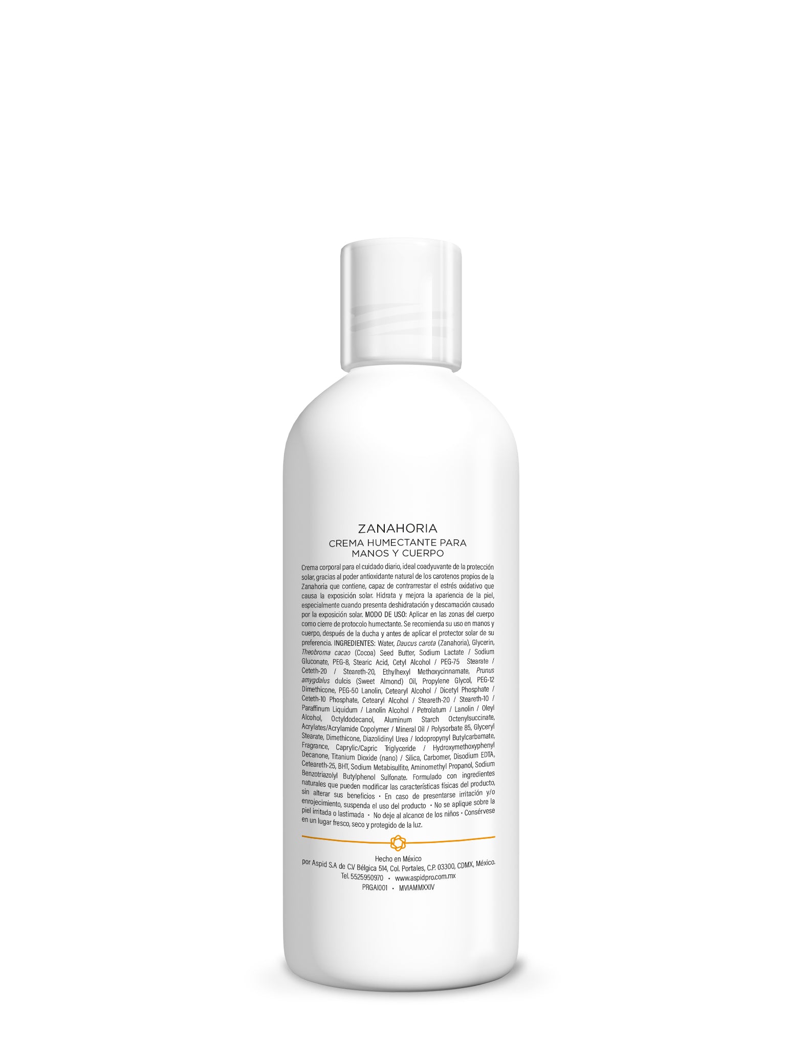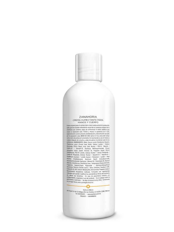 ZANAHORIA es una crema corporal coadyuvante de la protección solar, dado por el poder antioxidante natural de los carotenos propios de la zanahoria que contiene, capaz de contrarrestar el estrés oxidativo que causan los radicales libres, desencadenados por la exposición solar. Hidrata y mejora la apariencia de la piel.